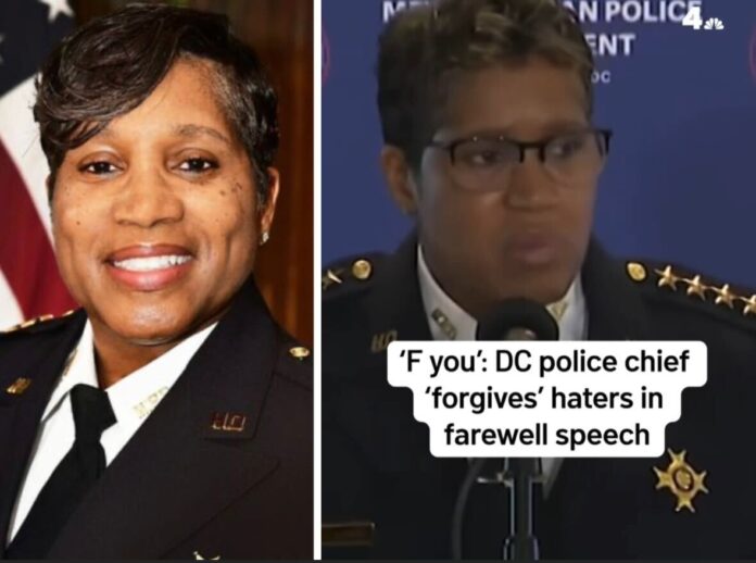 Pamela A. Smith, the outgoing chief of the Metropolitan Police Department, stunned audiences with a blunt and emotionally charged farewell speech in which she directly addressed critics, doubters, and online detractors.During her final remarks, Smith acknowledged the constant scrutiny and criticism that came with leading the nation’s capital police force. She punctuated her message with a raw statement that quickly went viral: “F you — and I forgive you.” Delivered with intensity and conviction, the comment drew a mix of applause, laughter, and surprise from those in attendance.Smith framed her words not as anger, but as release. She spoke about the toll leadership takes, the weight of public service, and the reality of being judged relentlessly while making high-pressure decisions in a highly visible role. Her remarks reflected the emotional strain many public officials face in an era shaped by social media, political division, and nonstop public commentary.The speech sparked widespread reaction online, with supporters praising Smith’s candor and critics debating the tone of a farewell address by a top law-enforcement official. Regardless of viewpoint, the moment resonated — highlighting the human side of leadership and the emotional cost of serving in one of the country’s most scrutinized public safety positions.As clips of the speech continue to circulate, Smith’s final words have become a focal point for broader conversations about policing, accountability, leadership, and what it means to exit a high-profile role without softening the experience.